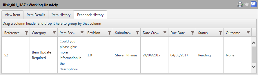 - Alternatively, select the Risk Hazard and click the View Item label from menu at the top of results grid and then click the Feedback History tab.