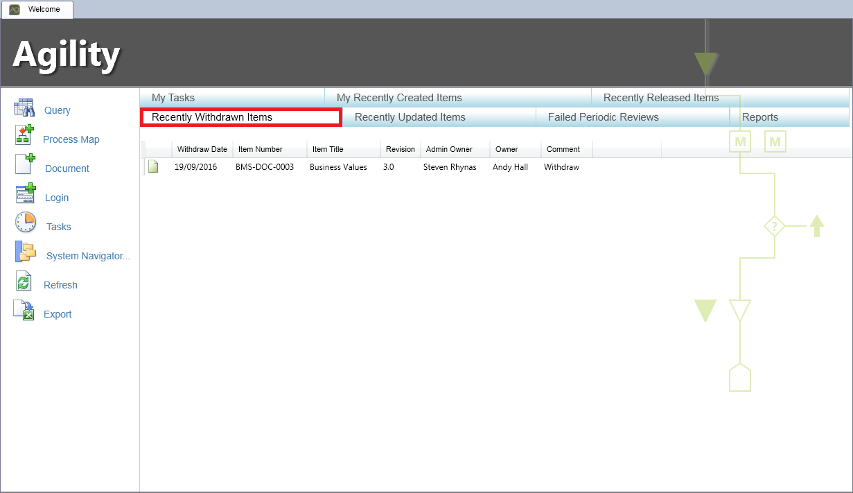 Welcome Page showing Recently Withdrawn Items – Recently Withdrawn Items in the past 7 days, up to 50 results, Withdrawn by all Administrators